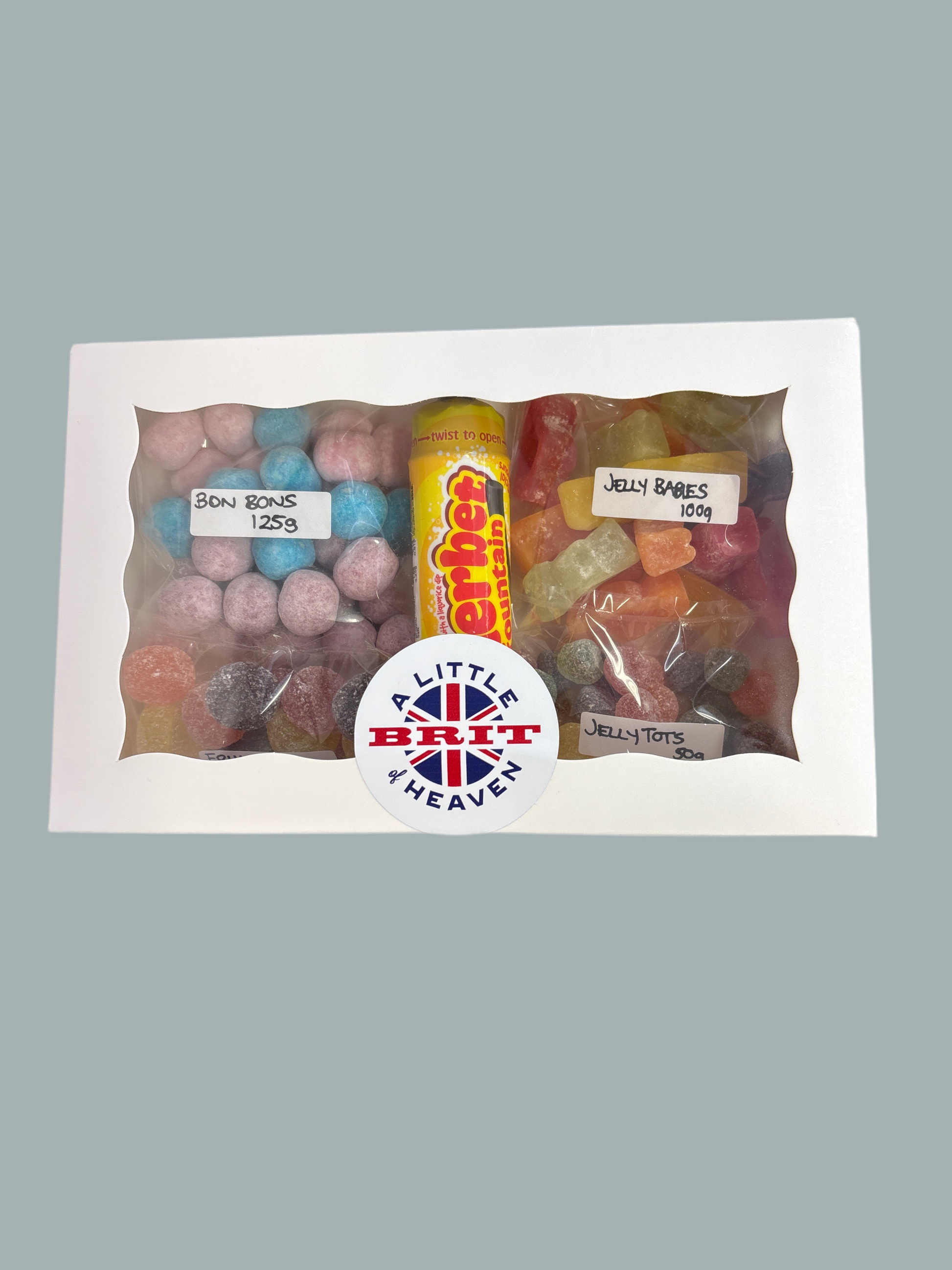 Includes: bonbons 125g, jelly babies 100g, fruit pastilles 47g, jelly tots 50g and one sherbet fountain.